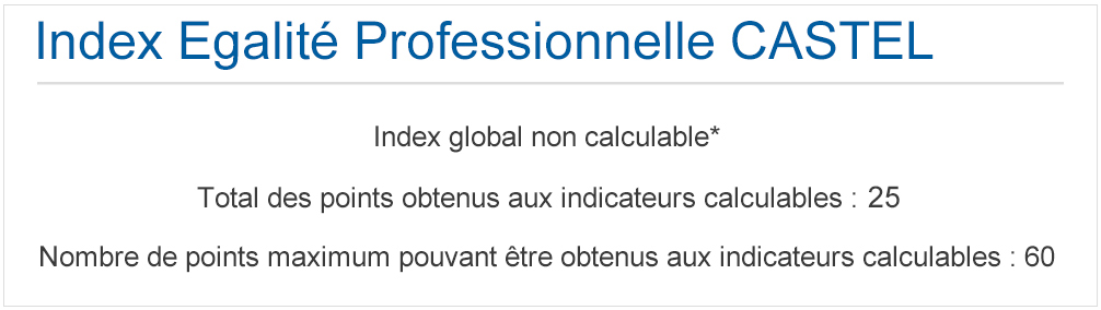 Pour l’année 2024, CASTEL a obtenu 50 points sur 60 sur les 3 indicateurs calculables.